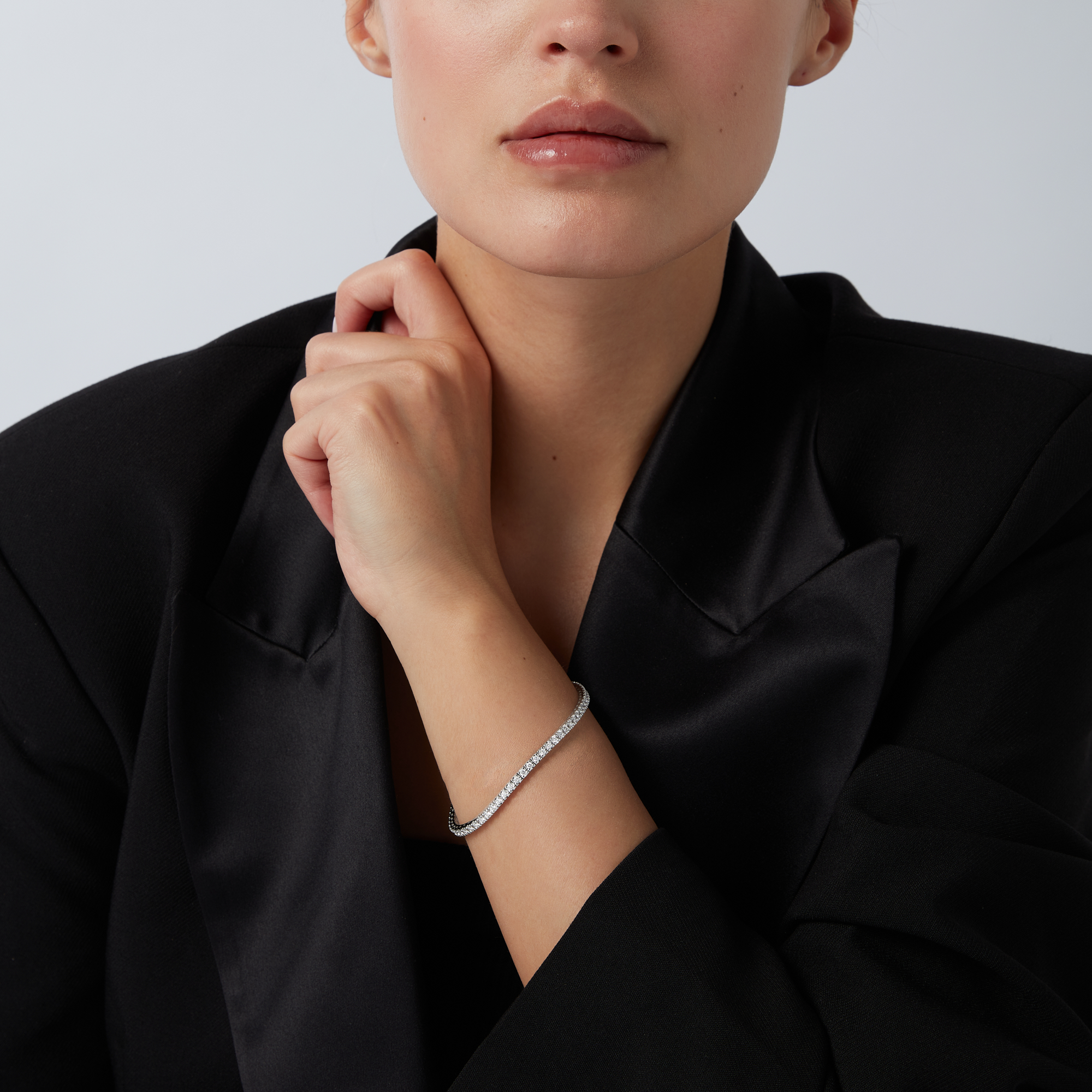 Design zdůrazňuje čisté linie a precizní zasazení, díky čemuž každý diamant krásně zachycuje a odráží světlo. Jeho flexibilní konstrukce zajišťuje pohodlné nošení na zápěstí, což z tohoto náramku dělá rafinovaný výraz nenápadného luxusu, ideální jak pro elegantní příležitosti, tak pro každodenní nošení.