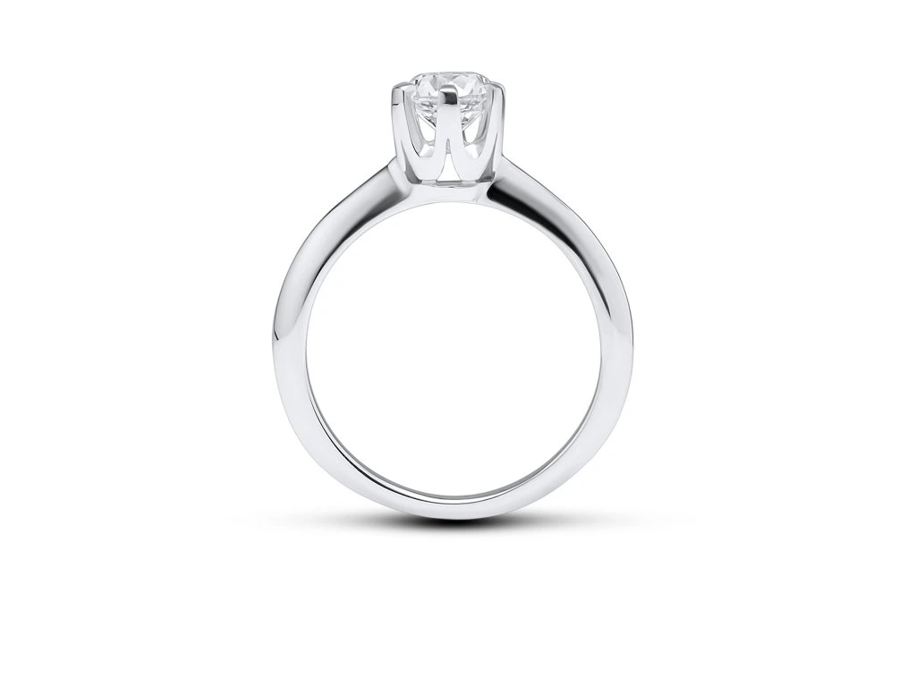 A refined symbol of commitment, this solitaire engagement ring expresses the purity and strength of an eternal promise. The central diamond is held in a classic six-prong setting, carefully designed to maximise light and enhance the stone’s natural brilliance while preserving a balanced and elegant silhouette.