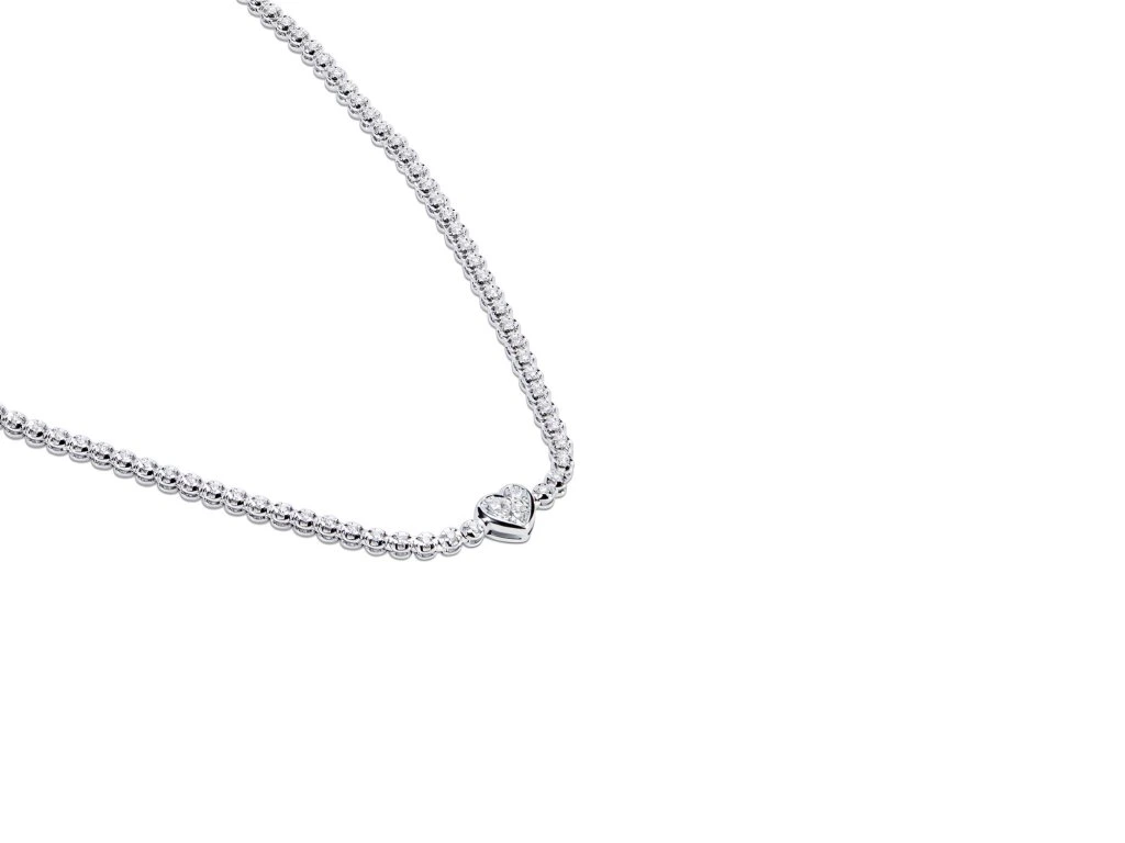 A refined symbol of emotion and elegance, this Heart choker captures the beauty of a timeless motif through a contemporary and luminous design. At its centre, the heart-shaped element glows with a delicate brilliance, while the line of diamonds creates a fluid ribbon of light that rests gracefully along the neckline.